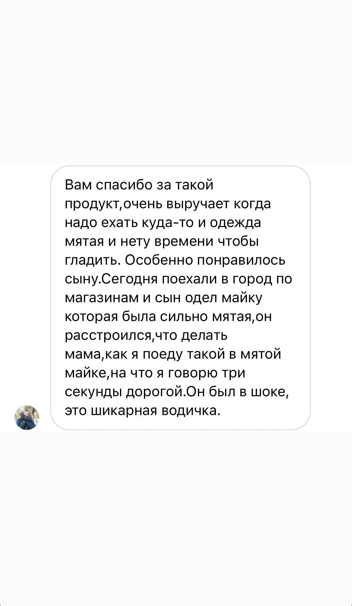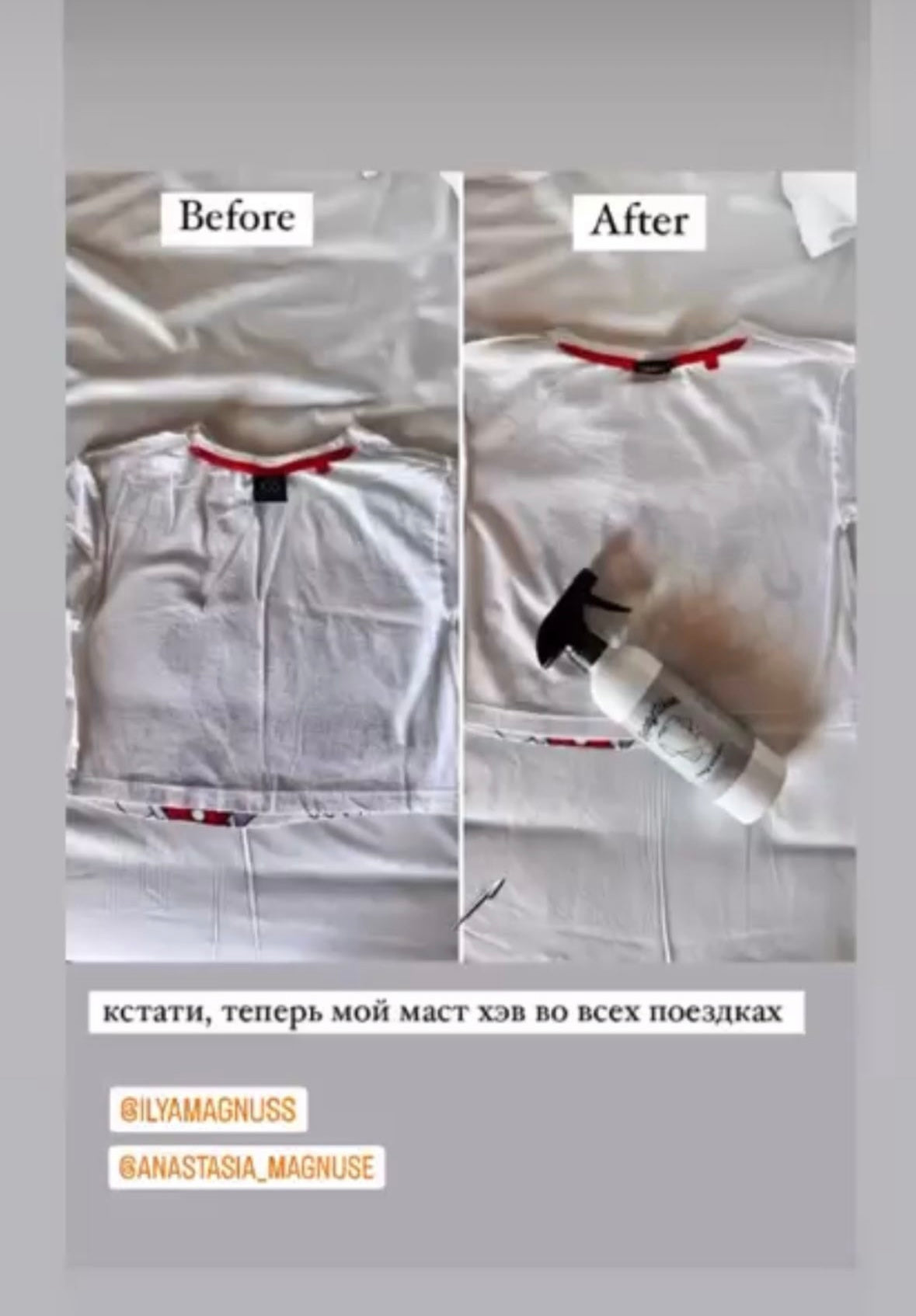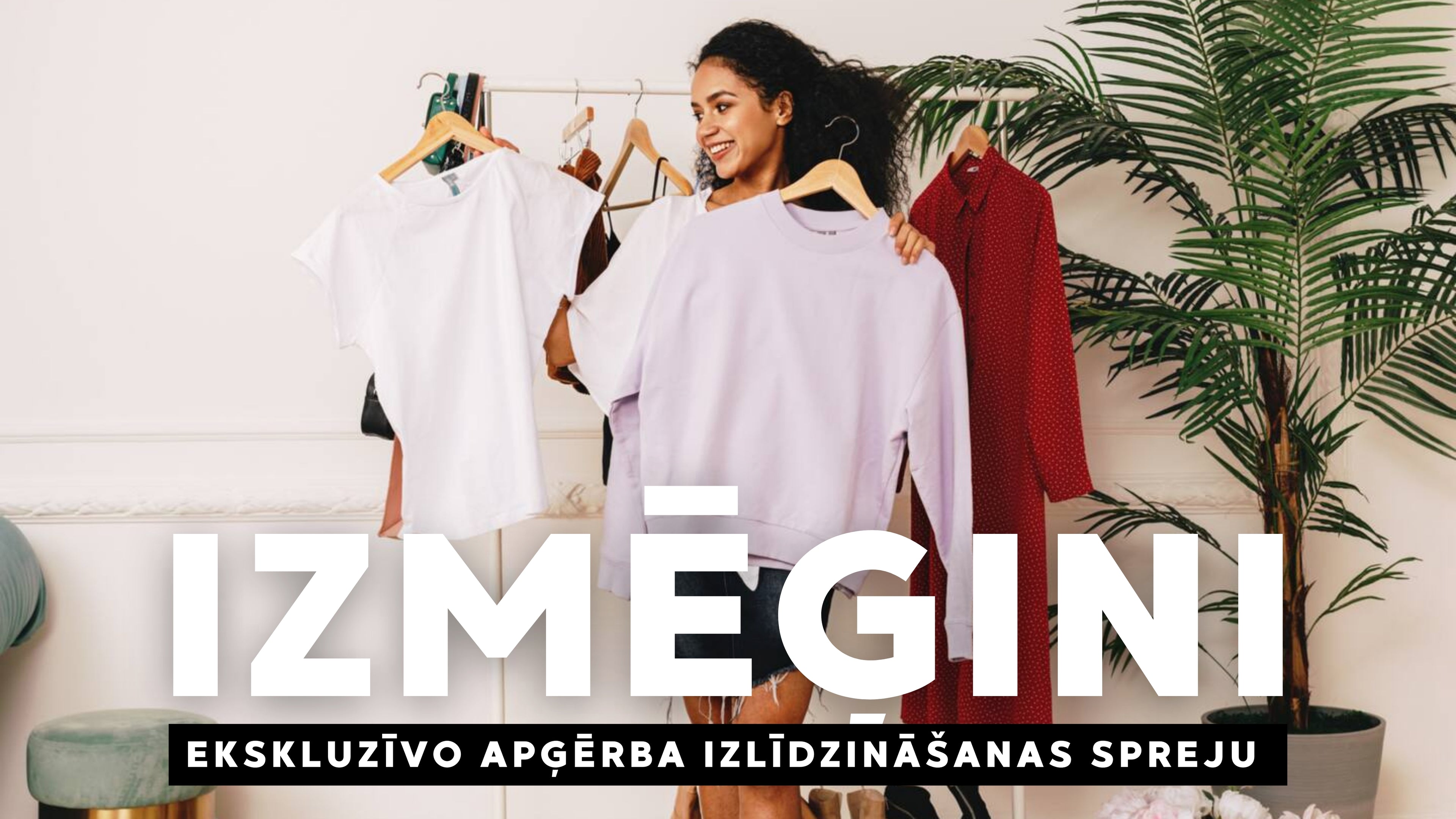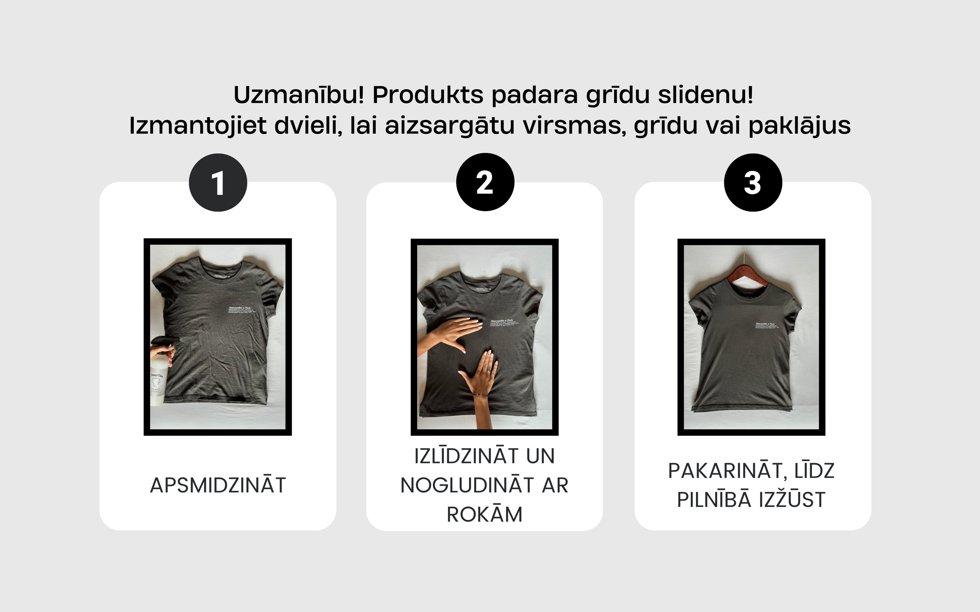 Izsmidziniet nelielu daudzumu līdzekļa uz apģērba, līdz tas viegli samitrinās. Ar rokam izlīdziniet visas krokas un pakariet apģērbu, lai tas pilnībā nožūtu.