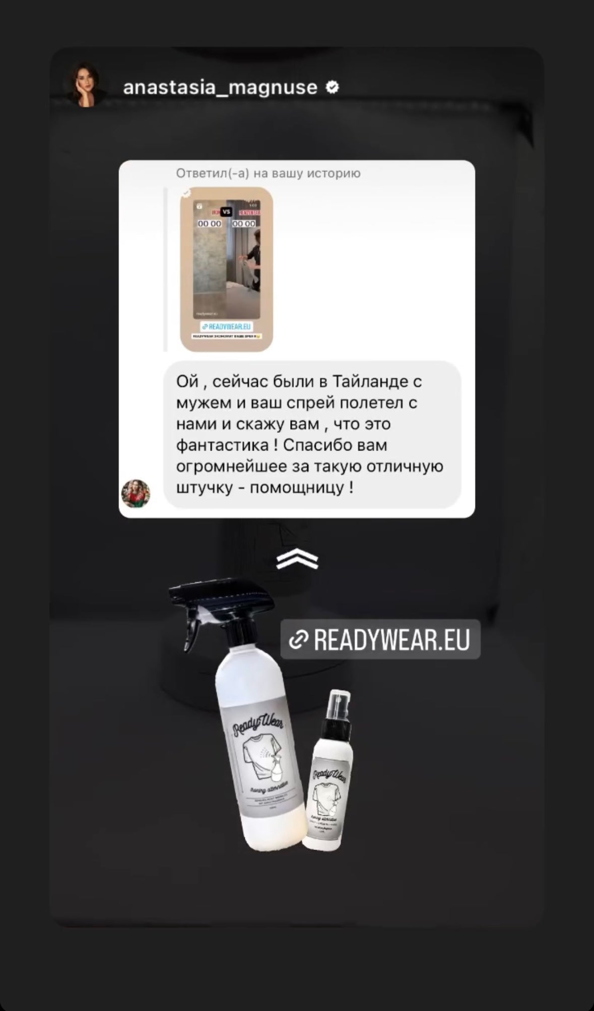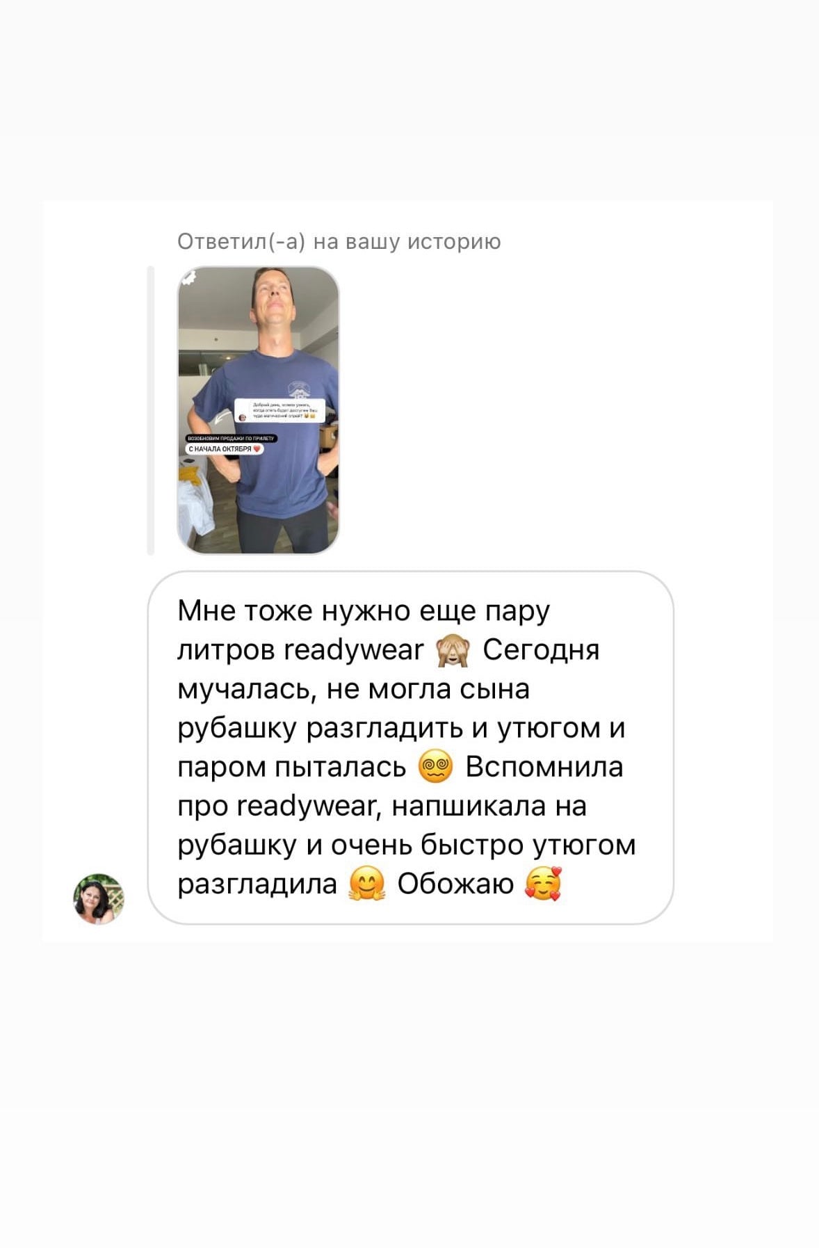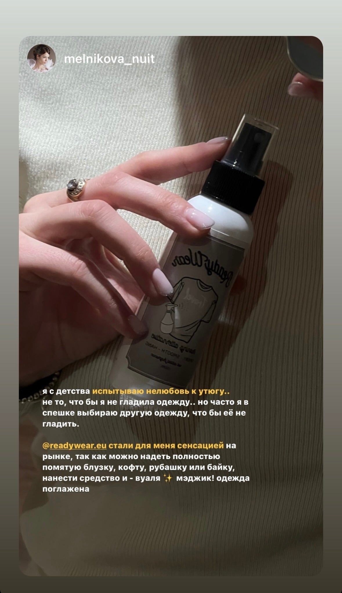ReadyWear spreja lietošana ietaupa jūsu laiku, un pēc tā uzklāšanas uz drēbēm tās kļūst mīkstākas. Sprejs ir lielisks pavadonis ceļojumos, jo tas aizņem maz vietas. Turklāt sprejs ir arī antistatiska iedarbība.